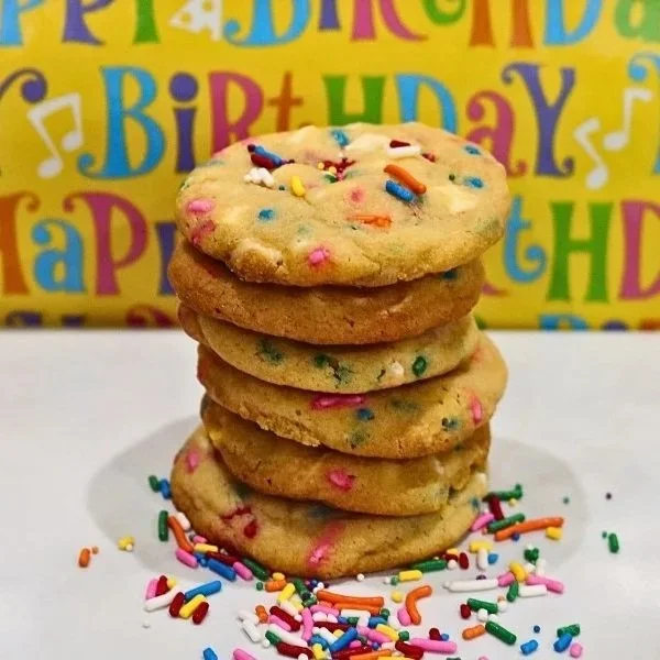 Buttery, chewy cookies with white chocolate chips and colorful sprinkles are my new favorite! Made with salted butter, pure vanilla and almond extracts, these cookies are sweet and sassy. Make anyone’s birthday a great reason to bake these or just bake them to celebrate any happy occasion!